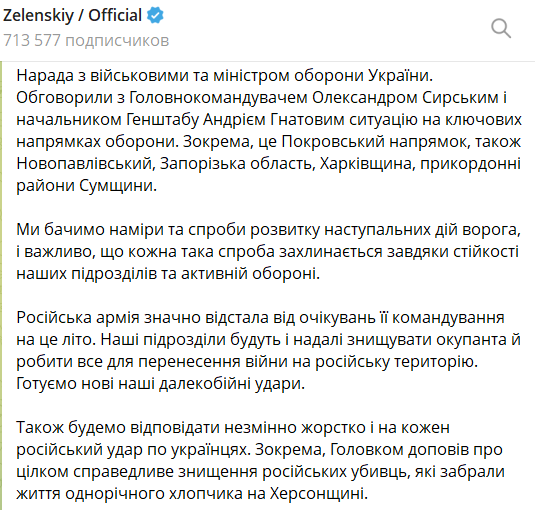 Президент України Володимир Зеленський анонсував нові далекобійні удари по російській території після наради з командуванням Збройних Сил.