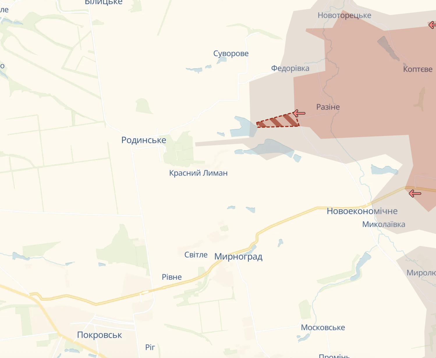 Росіяни знову просунулися на північ від Мирнограда, з боку Разіна, де "сіра зона" підійшла до міста Родинське. Про ситуацію на цьому напрямі ми писали тут.