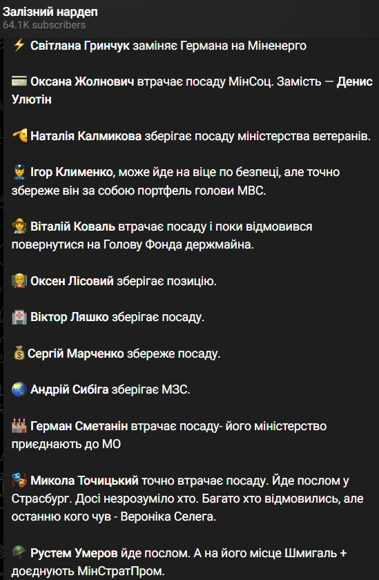 Прем'єр Денис Шмигаль іде у відставку і стає новим міністром оборони. Рустем Умеров їде послом до США. Голова Мінстратпрому Герман Сметанін втрачає посаду, а його міністерство приєднають до Міноборони.