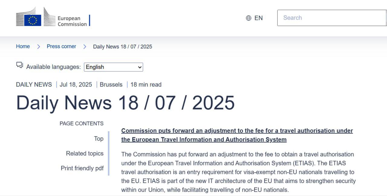 Єврокомісія збирається підвищити майже втричі плату за дозвіл на поїздку до Євросоюзу в рамках Європейської системи інформації та авторизації подорожей (ETIAS), яка почне працювати наприкінці 2026 року.