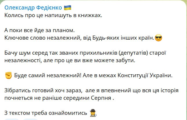 "Зібратися готовий хоч зараз, але я впевнений, що вся ця історія почнеться не раніше середини серпня. З текстом треба ознайомитись", - написав Федієнко у соцмережі.