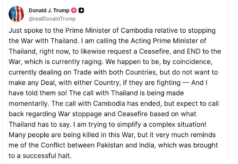 Глава Білого дому заявив, що поговорив із прем'єр-міністром Камбоджі Хуном Манетом про припинення війни з Таїландом. За його словами, він також має намір зв'язатися з в.о. прем'єра Таїланду Пхумтхам Вечайчай з тим самим проханням: домогтися припинення вогню та закінчення бойових дій.