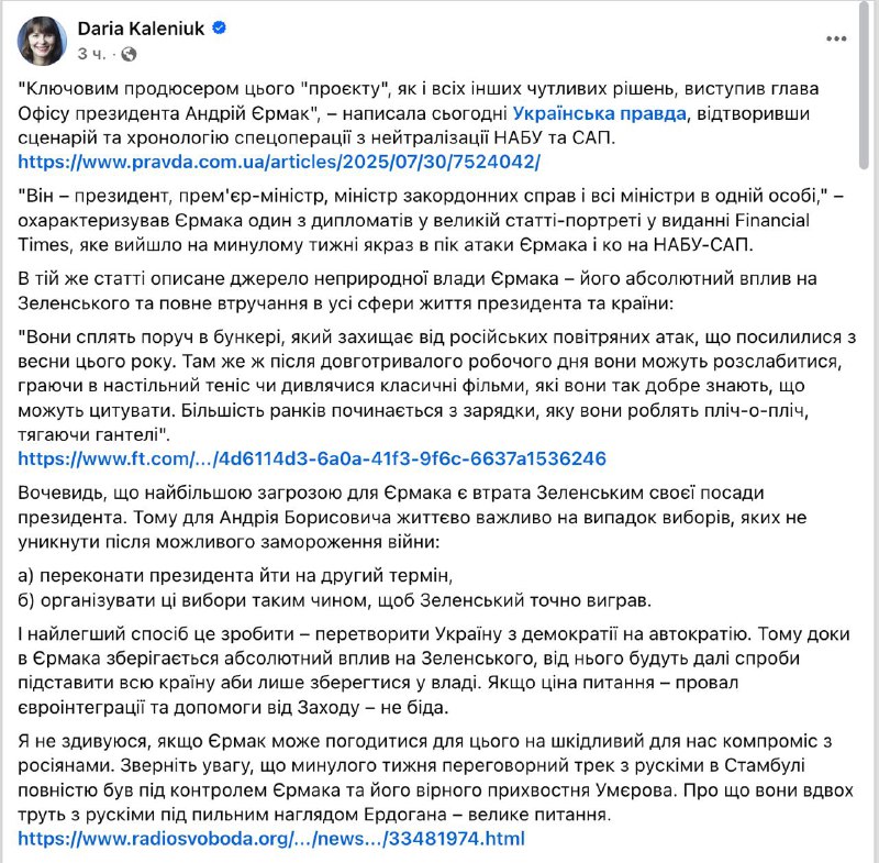 "Тому поки у Єрмака зберігається абсолютний вплив на Зеленського, від нього йтимуть і далі спроби підставити всю країну, аби зберегтися при владі. Якщо ціна питання – провал євроінтеграції та допомоги від Заходу – не біда. Я не здивуюся, якщо Єрмак може погодитися для цього на невигідний для нас компроміс з росіянами. росіянами в Стамбулі був повністю під контролем Єрмака та його вірного прихвостня Умерова.