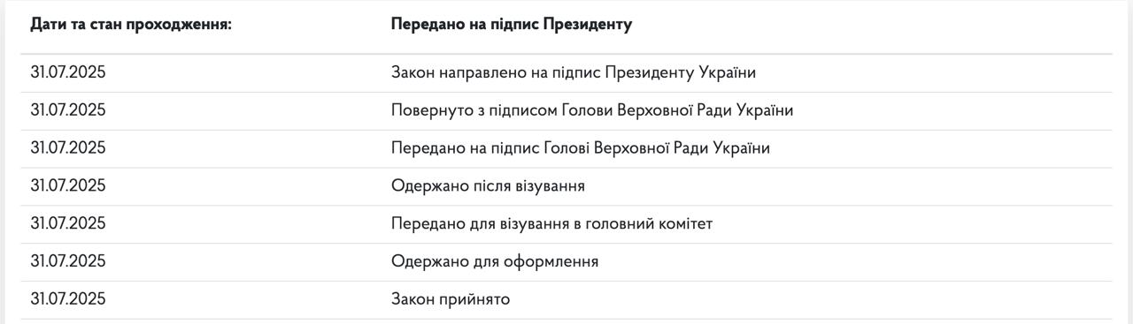 На момент виходу новини спікер Ради Руслан Стефанчук підписав ухвалений законопроект, про що свідчить картка документа на сайті парламенту.