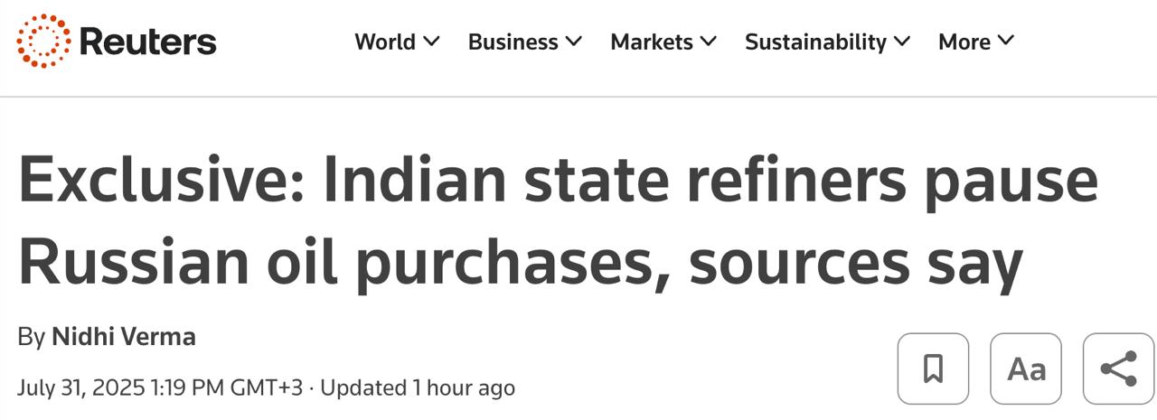 При цьому не уточнюється, чи закупівлі продовжують приватні НПЗ, які теж є великими покупцями російської нафти в Індії (державні НПЗ контролюють понад 60% від загальних нафтопереробних потужностей країни).