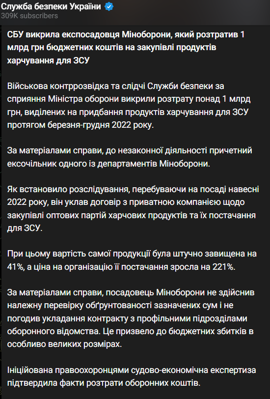 Підозру отримав ексглава одного з департаментів Міноборони, який уклав договір із приватною компанією про закупівлю оптових партій продуктів. Вартість продуктів була штучно завищена на 41%, а ціна на організацію постачання зросла на 221%.