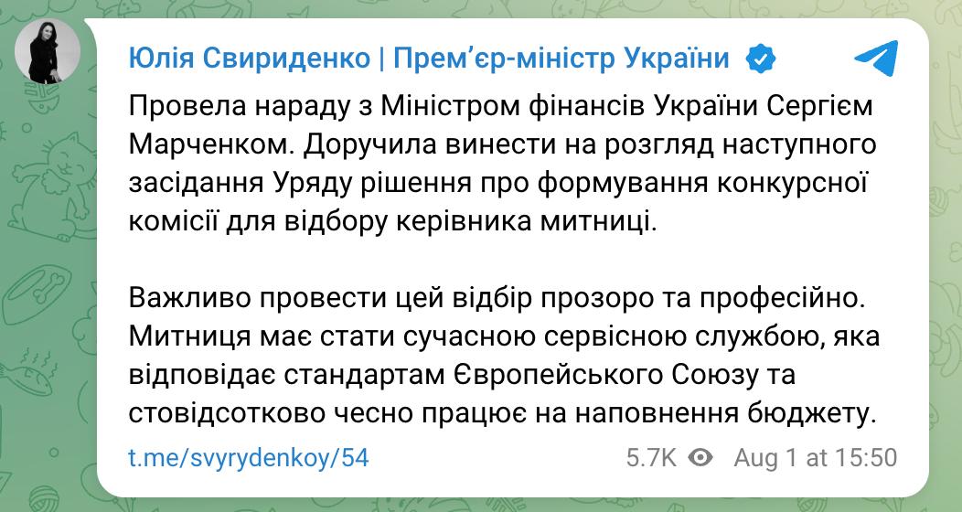 "Провела нараду з міністром фінансів України Сергієм Марченком. Доручила винести на розгляд наступного засідання уряду рішення про формування конкурсної комісії для відбору керівника митниці", - сказано у публікації Свириденко.