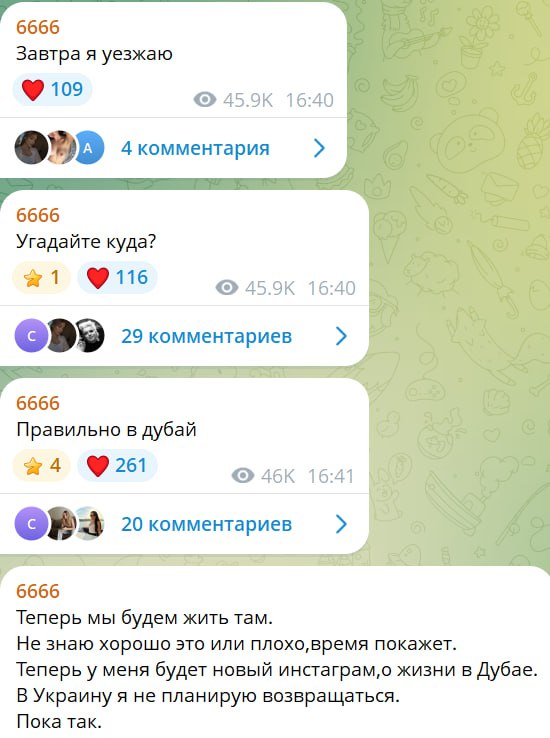 "Завтра я їду. Вгадайте, куди. Правильно, в Дубай. Тепер ми житимемо там. Не знаю, добре це чи погано, час покаже. Тепер у мене буде новий Інстаграм, про життя в Дубаї. В Україну я не планую повертатися. Поки що так", - сказано в публікаціях.