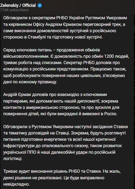 "Обговорили із секретарем РНБО України Рустемом Умеровим та керівником Офісу Андрієм Єрмаком переговорний трек, а саме виконання домовленостей зустрічей з російською стороною у Стамбулі та підготовку нової зустрічі", - написав він.