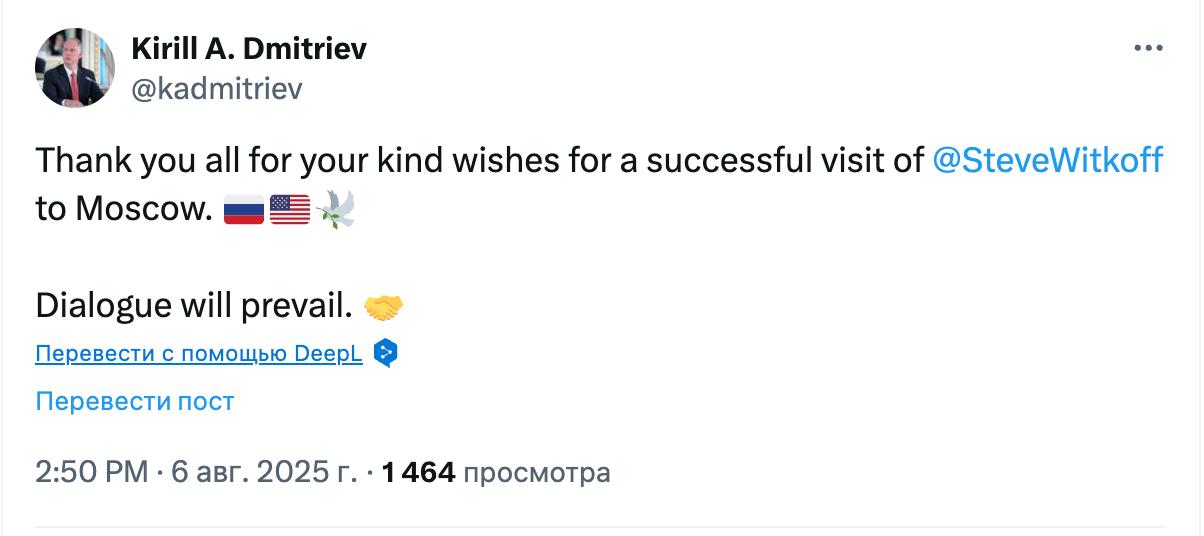 Також відреагував на зустріч спецпредставник Путіна Кирило Дмитрієв. Він назвав візит до Москви спецпредставника Трампа успішним.