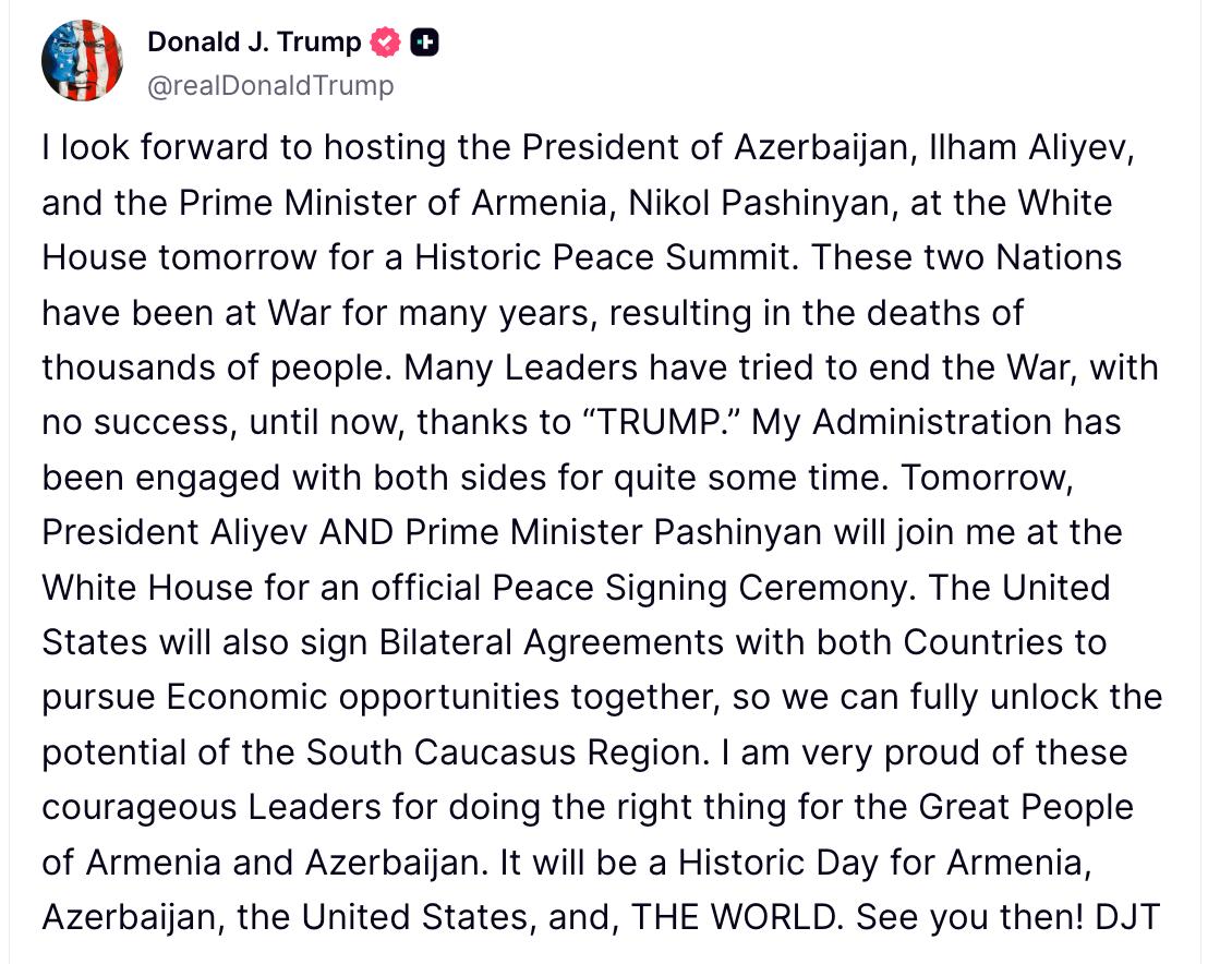 "Завтра президент Алієв та прем'єр-міністр Пашинян приєднаються до мене в Білому домі на офіційній церемонії підписання мирної угоди. Сполучені Штати також підпишуть двосторонні угоди з обома країнами для спільного розвитку економічних можливостей, щоб повністю розкрити потенціал регіону Південного Кавказу", - написав президент США.
