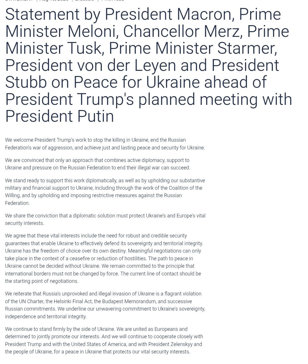06:53 Лідери Франції, Італії, Німеччини, Польщі, Великобританії та Фінляндії, а також Єврокомісії зробили офіційну заяву напередодні переговорів Путіна та Трампа.