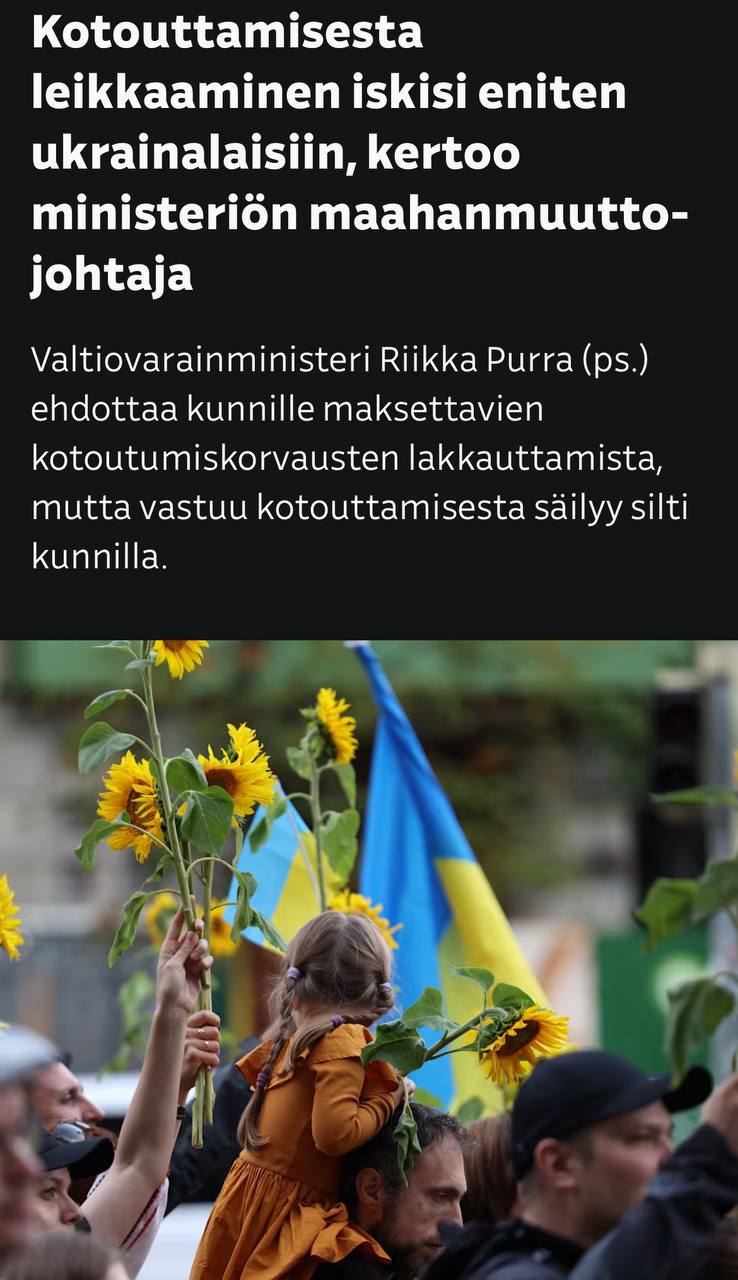 У Фінляндії зараз перебуває близько 46 тисяч українців, на яких виділяється 317 млн. євро допомоги на рік. Міністр фінансів Рійкка Пурра запропонував заощадити ці гроші за рахунок скасування виплат протягом наступних двох років.