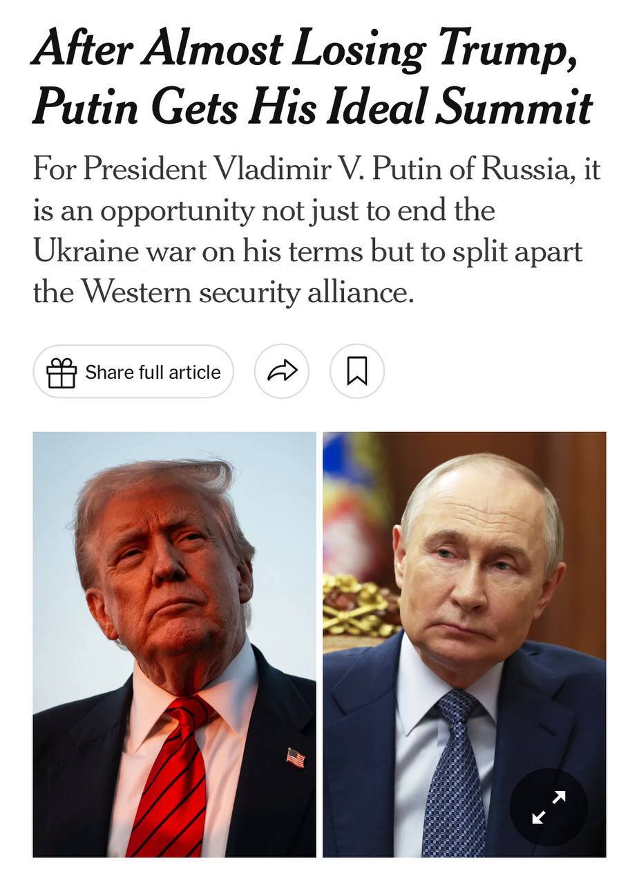 "Для президента Росії це можливість не лише закінчити війну в Україні на своїх умовах, а й розколоти західний альянс безпеки", - йдеться у статті.