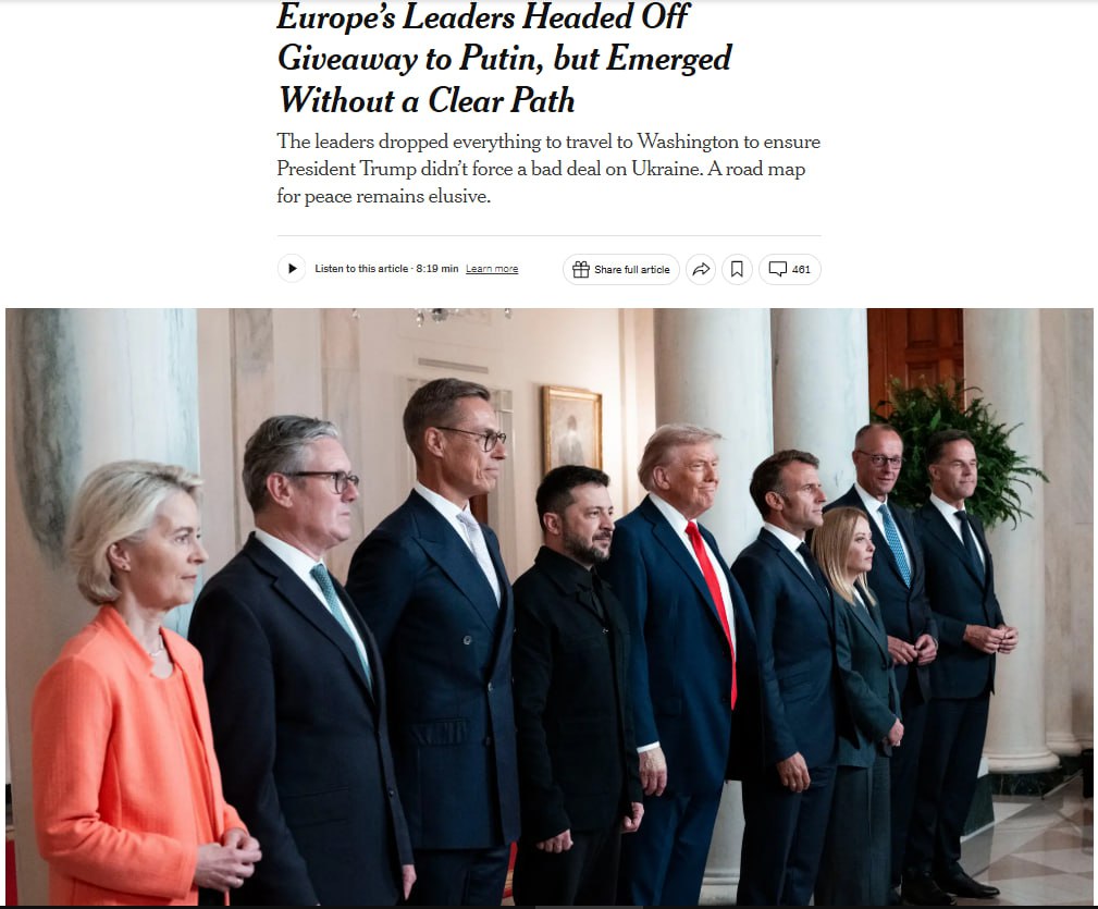 "Пан Путін запропонував провести зустріч у Москві, про що він вперше заявив в Анкориджі, повідомив високопоставлений європейський дипломат, поінформований про телефонну розмову. Європейські лідери були налякані таким сценарієм, але пан Трамп чемно відхилив пропозицію пана Путіна, додав дипломат", - повідомляє The New York Times.