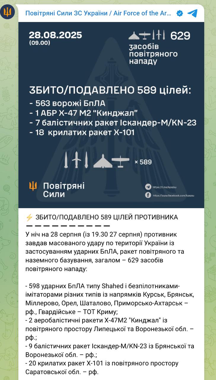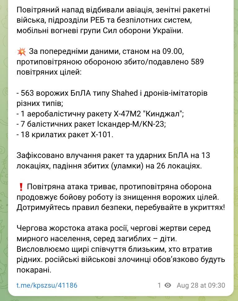 09:35 Україну вночі атакували 598 БПЛА, включаючи "Шахеди", та 31 ракета. Були прильоти у 13 локаціях.