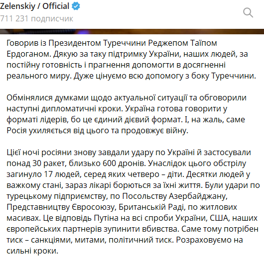 "Були удари по турецькому підприємству, посольству Азербайджану, представництву Євросоюзу, Британській раді, житловим масивам. Це відповідь Путіна на всі спроби України, США, наших європейських партнерів зупинити вбивства. Саме тому потрібен тиск – санкціями, митами, політичний тиск. Розраховуємо на сильні кроки".