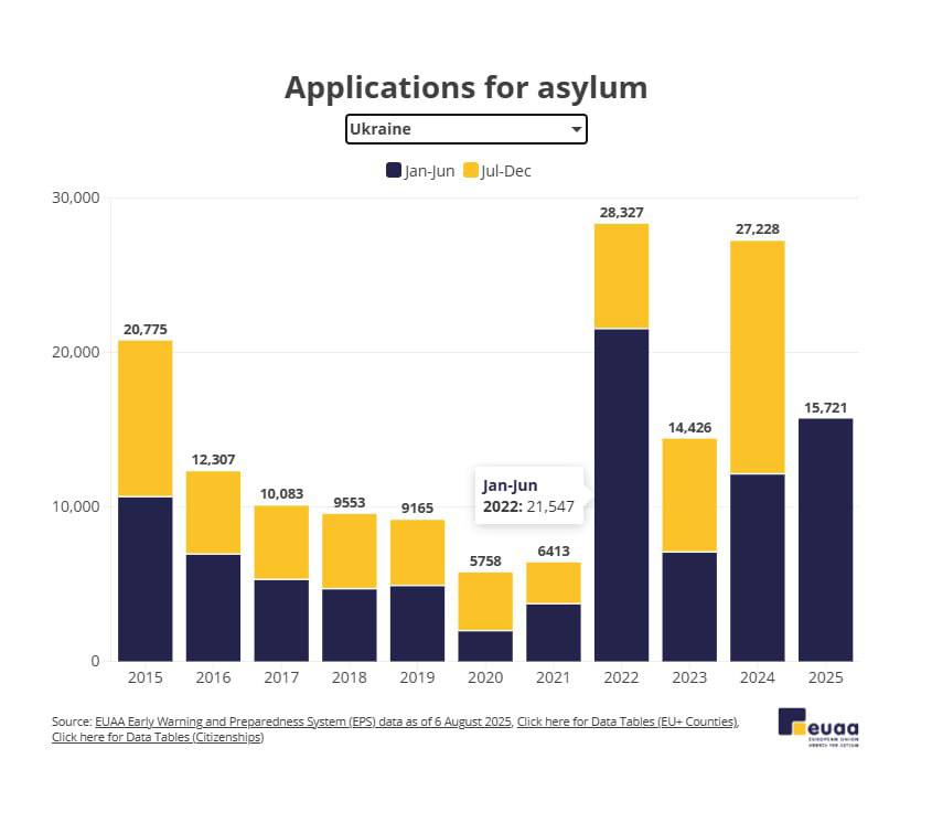 Згідно з ним, за перше півріччя 2025 року кількість заяв на притулок від громадян України у країнах ЄС та Швейцарії зросла на 29% та становила 16 тисяч.