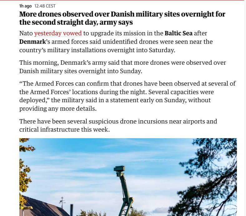 У Данії над військовими базами другу ніч поспіль літали невідомі дрони - The Guardian