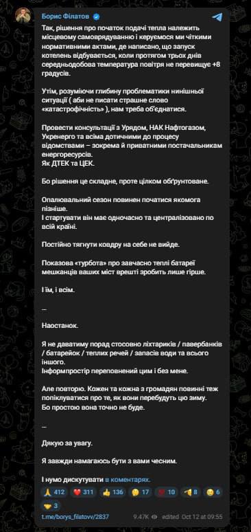 "Опалювальний сезон повинен початися якомога пізніше. І стартувати він повинен одночасно і централізовано по всій країні. Показова "турбота" про заздалегідь теплі батареї жителів ваших міст зрештою зробить тільки гірше. І наостанок. Я не даватиму поради по ліхтарикам, павербанкам, батареям, теплим речам. цим і без мене. Але повторюю. Кожен із громадян має подбати про те, як він переживуть цю зиму.