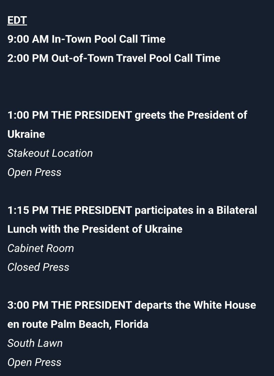 О 20:00 за Києвом президенти зустрінуться та проведуть короткий брифінг для преси, який триватиме близько 15 хвилин. Потім розпочнеться закритий обід Трампа та Зеленського. І вже на 22:00 заплановано виліт американського президента до Флориди.