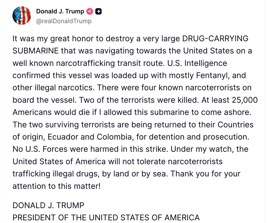 Президент США Дональд Трамп заявив, що американські військові знищили "велику субмарину, яка перевозила наркотики", яка йшла до берегів США.