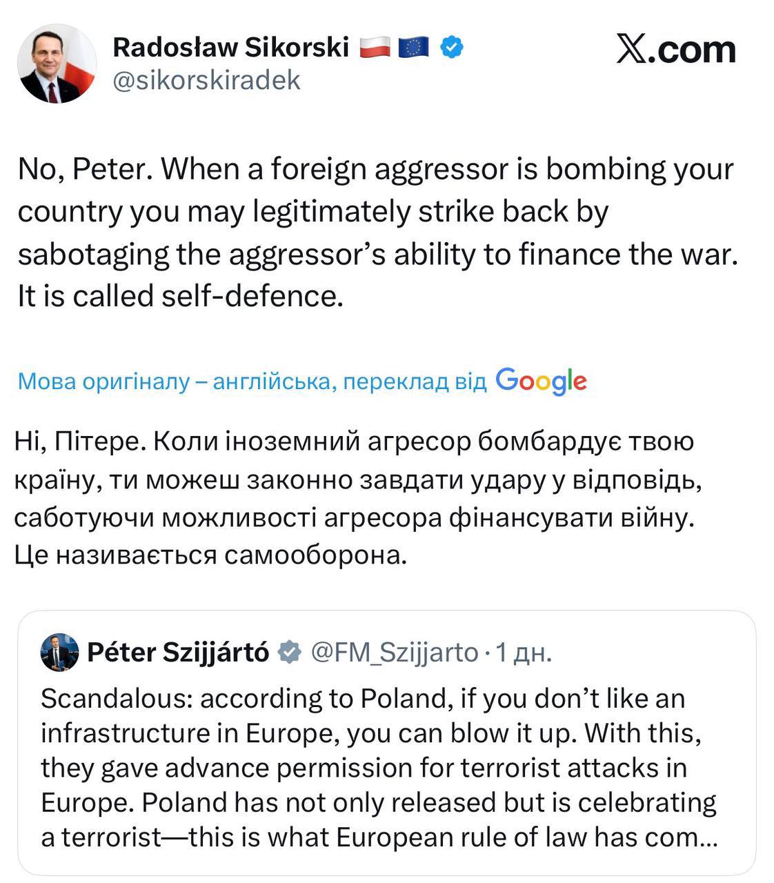 "Ні, Петре. Коли іноземний агресор бомбардує твою країну, ти маєш законне право завдати удару у відповідь, саботуючи можливості агресора фінансувати війну", - написав Сікорський у відповідь на посаду угорського колеги.