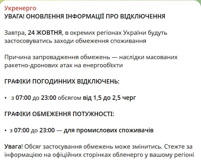 20.26 "Укренерго" повідомляє, що завтра відключення будуть у "окремих" регіонах (але не уточнює, в яких).