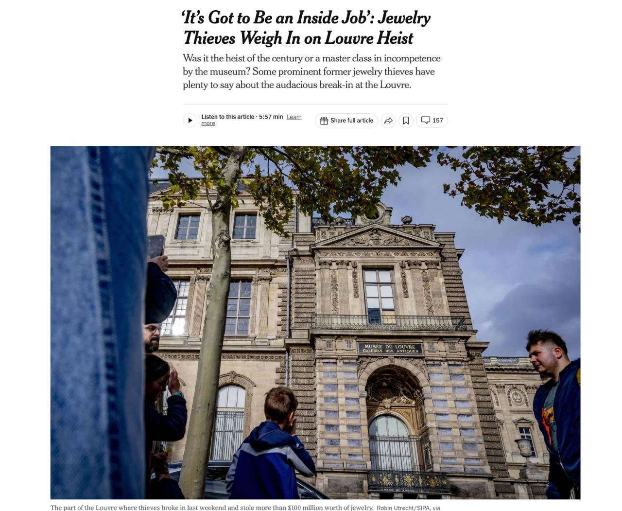 Багато відомих колишніх грабіжників ювелірних виробів також упевнені, що на Лувр навів хтось зсередини, пише New York Times.