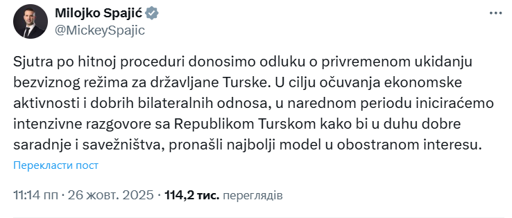 Спаїч наголосив, що безвізовий режим із Туреччиною тимчасово припиняється для забезпечення безпеки та громадського порядку.