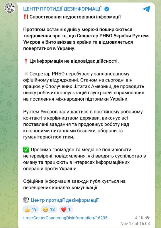 Незабаром після появи публікації Центр протидії дезінформації при РНБО заперечив, що секретар відомства відмовляється повертатися до України. У центрі заявили, що Умеров вже перебуває в США, де "проводить низку робочих консультацій та зустрічей, спрямованих на посилення міжнародної підтримки України", "залишається у постійному робочому контакті з керівництвом держави, виконує всі поставлені завдання та продовжує роботу над ключовими питаннями безпеки, оборони та гуманітарної політики".
