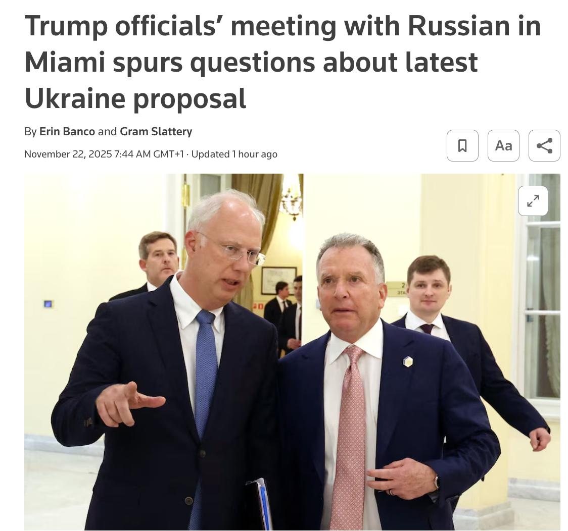 За інформацією видання, наприкінці жовтня у Майамі відбулася зустріч за участю спецпредставника Трампа Стівена Віткоффа, зятя президента США Джереда Кушнера, представника президента РФ Кирила Дмитрієва "і, ймовірно, Рустема Умерова".