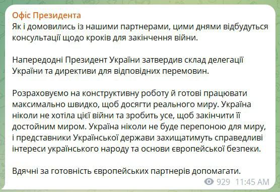 "Як і домовилися з нашими партнерами, у ці дні відбудуться консультації щодо кроків після закінчення війни. Президент України затвердив склад делегації України та директиви для відповідних переговорів. Розраховуємо на конструктивну роботу і готові працювати максимально швидко, щоб досягти реального світу", - йдеться у заяві.
