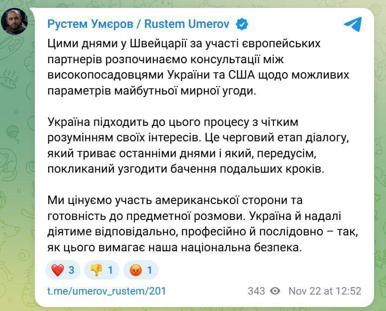 Секретар Ради національної безпеки і оборони Рустем Умеров заявив, що у Швейцарії найближчими днями відбудуться переговори України та США за участю європейців щодо мирного плану президента США Дональда Трампа.