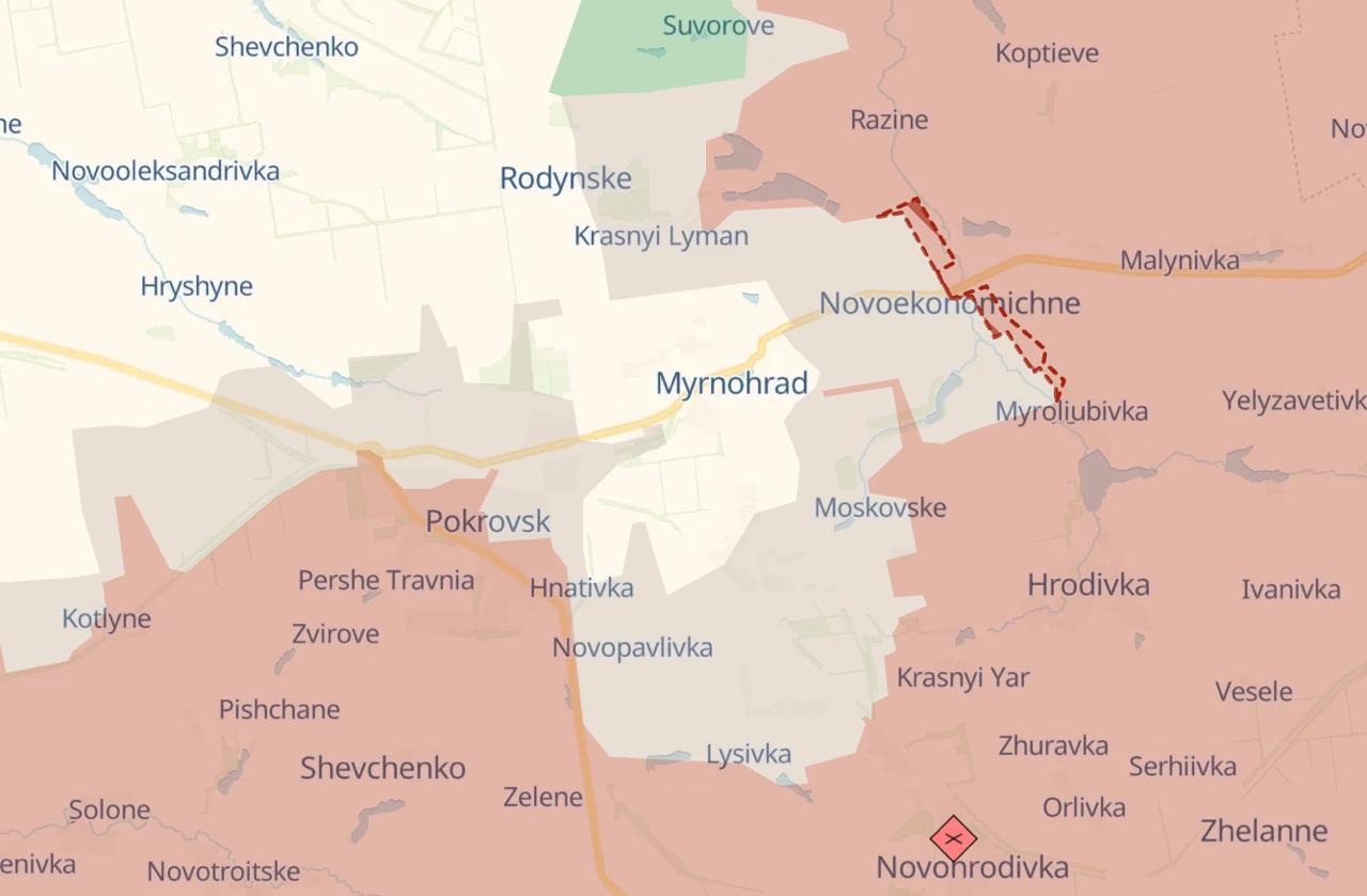 Тим часом російські телеграм-канали вчора написали, що дорога між Покровськом та Мирноградом вже фізично перерізана та Мирноград повністю оточений, а Покровськ цілком захоплений.
