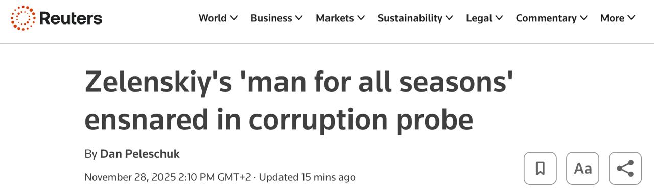 "Якщо Єрмака змусять піти у відставку, це можна буде розцінювати як зобов'язання навести лад, але також і як ознака того, що звинувачення в корупції підбираються все ближче до самого президента. Занепокоєння американських чиновників звинуваченнями у хабарництві, через які вже втратили посади два міністри, підірвала позиції Зеленського в той момент, коли він найбільше потребує їхньої довіри. Україна перебуває під тиском США, які вимагають ухвалити мирні пропозиції. Корупційний скандал також виник у той момент, коли Україна намагається показати Європейському Союзу, що вона бореться з корупцією, що є ключовим завданням для неї на шляху вступу до цього блоку.", - йдеться у статті.