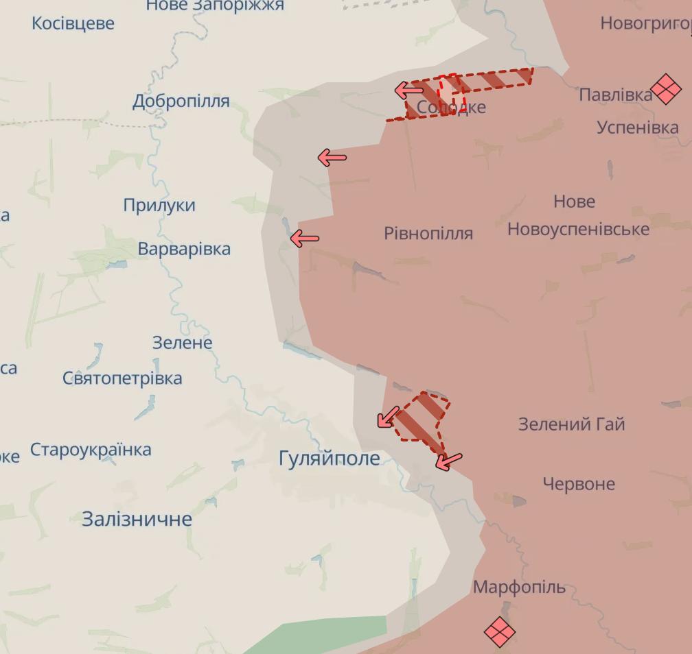 Окремо експерт наголошує, що темпи наступу тут суттєво вищі, ніж на інших ділянках фронту: близько 3 км на добу. На ділянці завширшки понад 40 км російські сили одночасно просуваються відразу в кількох напрямках, що чинить тиск по всій лінії оборони. У разі успішного охоплення, попереджає Машовець, у противника з'являться реальні шанси прорватися до Новомиколаївки та загрожувати вже Оріхівському району, фактично "згортаючи" оборону ЗСУ на південний схід від Запоріжжя (про те, що саме такою може бути мета всього наступу на Дніпропетровсько-Запорізькому напрямку).