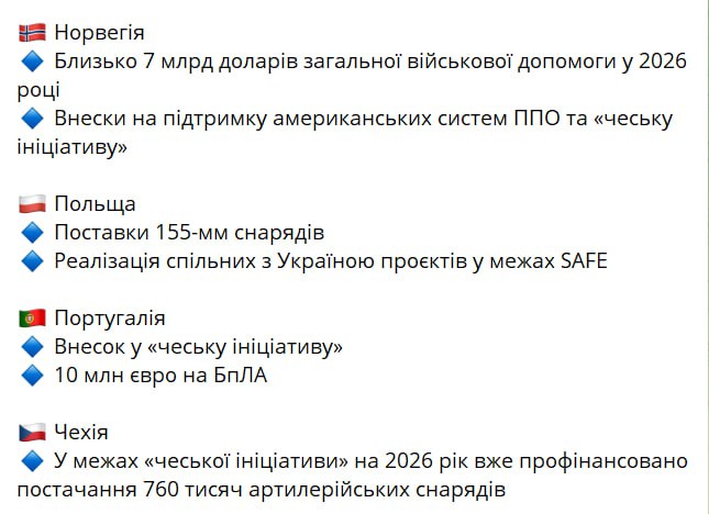 • Норвегія - близько 7 млрд доларів загальної військової допомоги у 2026 році, у тому числі внески на підтримку американських систем ППО та "чеську ініціативу";