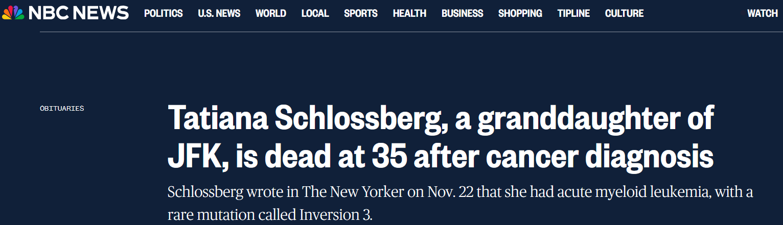 Як повідомляє NBS News, хвороба у онуки Кеннеді була діагностована 25 травня 2024 року, коли Шлоссберг народила другу дитину. Лікар помітив у неї аномально високий рівень лейкоцитів та призначив додаткові аналізи. Потім вона провела п'ять тижнів у лікарні Columbia-Presbyterian Hospital у Нью-Йорку, після чого розпочала хіміотерапію вдома, а пізніше перенесла пересадку кісткового мозку.