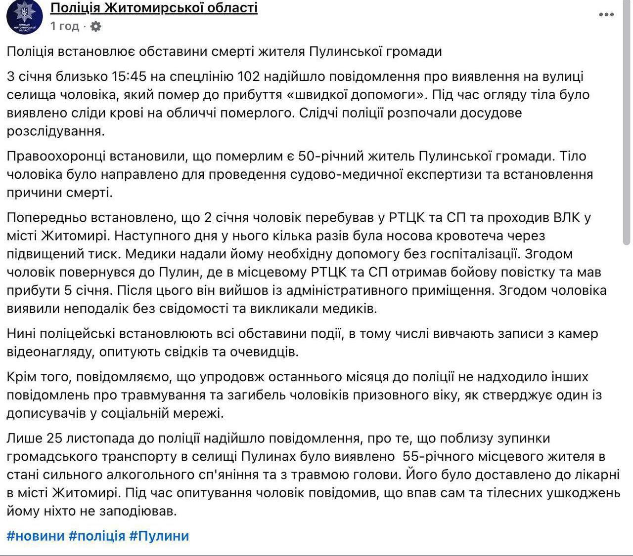 "2 січня чоловік перебував у РТЦК та СП і проходив ВЛК у м. Житомирі. Наступного дня у нього кілька разів йшла кров із носа через високий кров'яний тиск. Лікарі надали йому необхідну допомогу без госпіталізації", - йдеться у повідомленні.