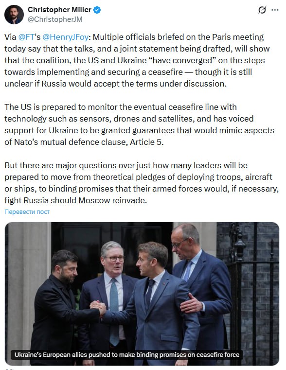 При цьому в його інсайді немає пункту про введення західних військ в Україну відразу після припинення вогню, на чому раніше наполягали Київ і європейці. Як бачимо, він говорить лише про контроль за лінією фронту та про те, як відреагує західні країни, якщо Росія розпочне нове вторгнення.