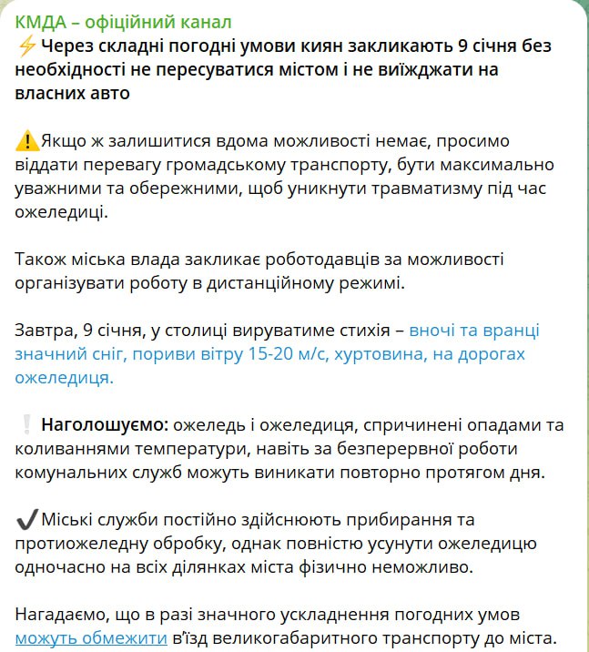 При цьому у Київській міській державній адміністрації закликають киян завтра без необхідності не пересуватися містом через складні погодні умови.