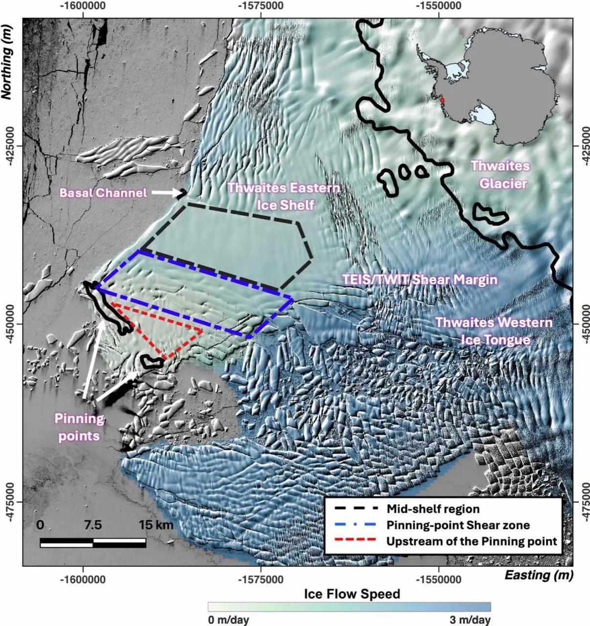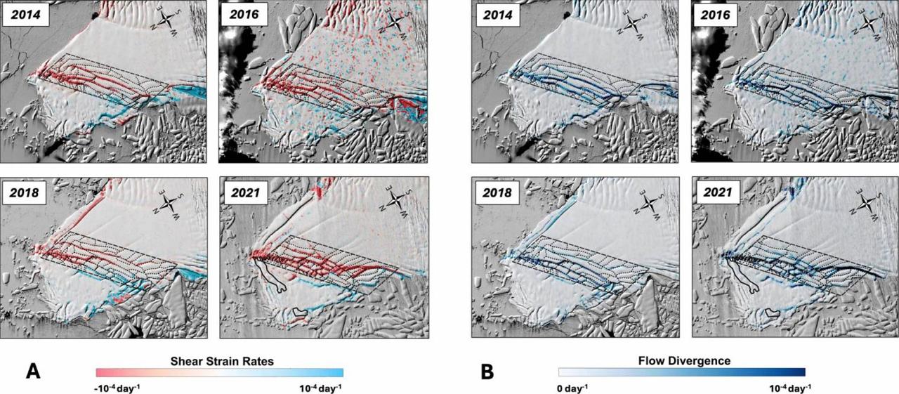 Вчені зафіксували зростання та поглиблення великих тріщин у льоду. Через це льодовик втрачає контакт із ділянками морського дна, які раніше уповільнювали його сповзання. В результаті потік льоду прискорюється, а сама структура шельфу стає менш стійкою.