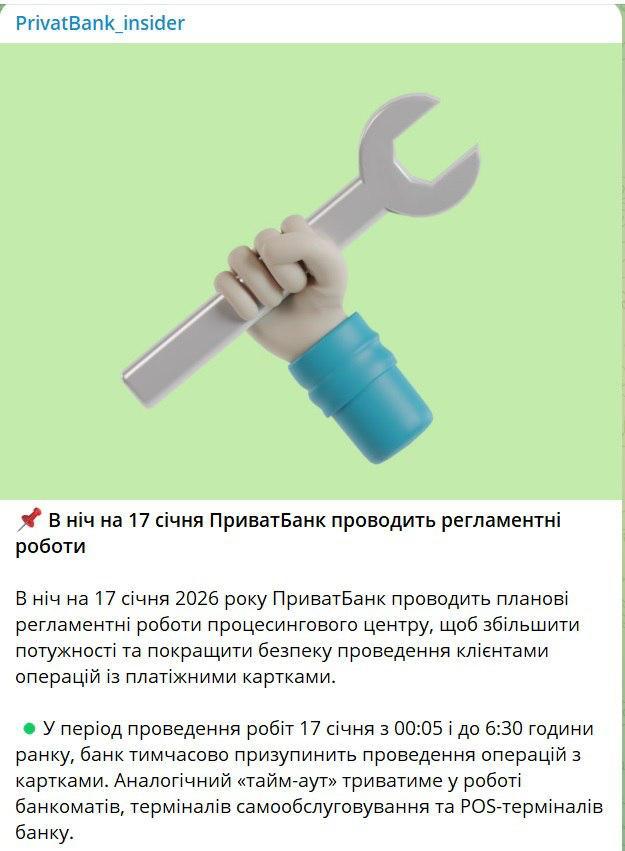 "Зазвичай такі технічні роботи ми робимо в нічний час, коли більшість клієнтів не здійснюють операції. Якщо в період регламентних робіт ви плануєте будь-які оплати, радимо зробити це заздалегідь або провести після їх завершення", - йдеться у повідомленні.