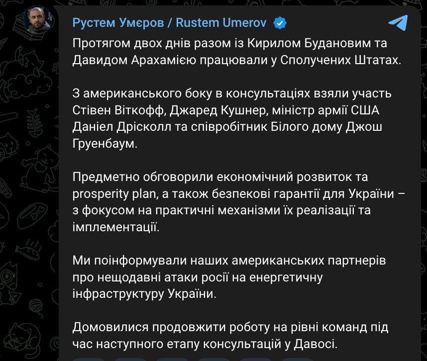 "Предметно обговорили економічний розвиток та план процвітання (prosperity plan), а також гарантії безпеки для України – з фокусом на практичні механізми їх реалізації та імплементації… Домовилися продовжити роботу на рівні команд на наступному етапі консультацій у Давосі", – заявив секретар РНБО.