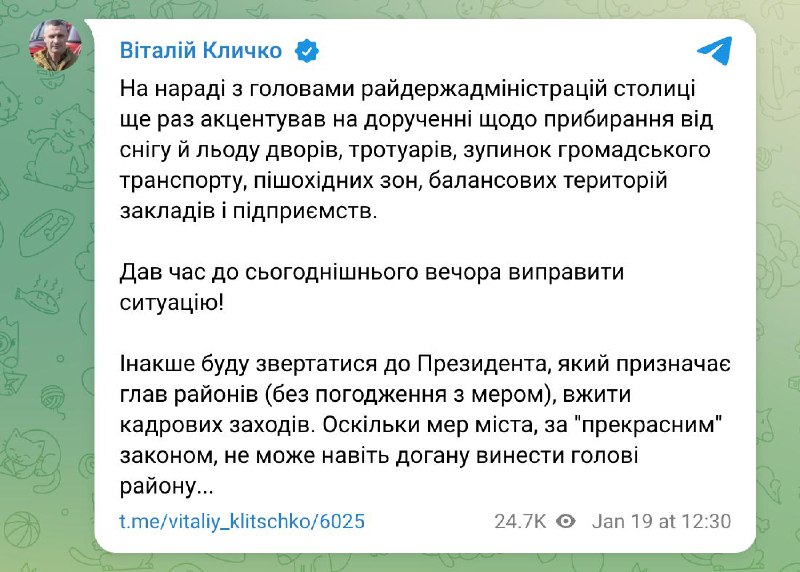 "На нараді з головами райдержадміністрацій столиці ще раз акцентував увагу на дорученні про прибирання від снігу і льоду дворів, тротуарів, зупинок громадського транспорту, пішохідних зон, балансових територій закладів і підприємств. Пора до сьогоднішнього вечора виправити ситуацію з головою вжити кадрових заходів. Оскільки мер міста за "прекрасним" законом не може навіть догану винести голові району..." - сказано в публікації.