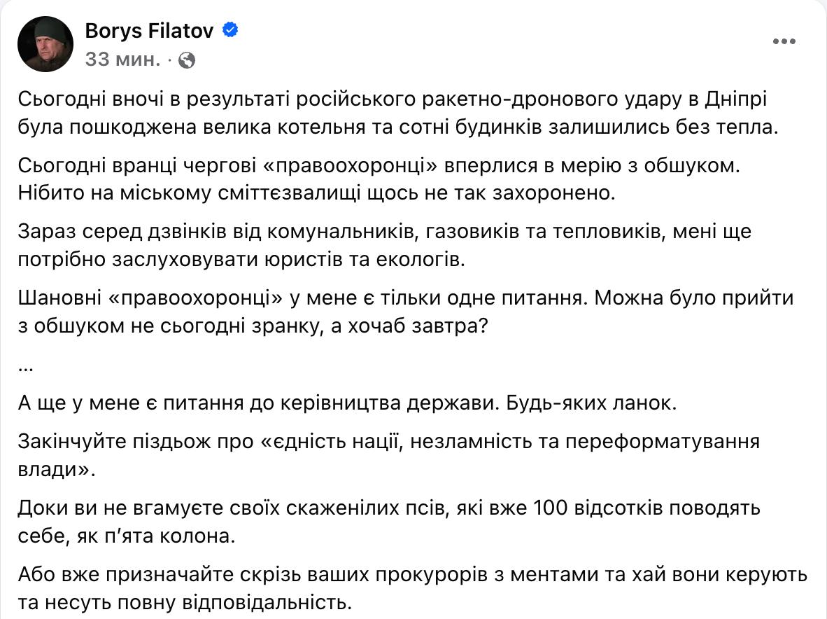 Також він повідомив, що сьогодні вночі внаслідок російського ракетно-дронового удару в Дніпрі було пошкоджено велику котельню, і сотні будинків залишилися без тепла. Філатов поскаржився на те, що поряд із дзвінками від комунальників та газовиків йому ще доводиться вислуховувати юристів та екологів.