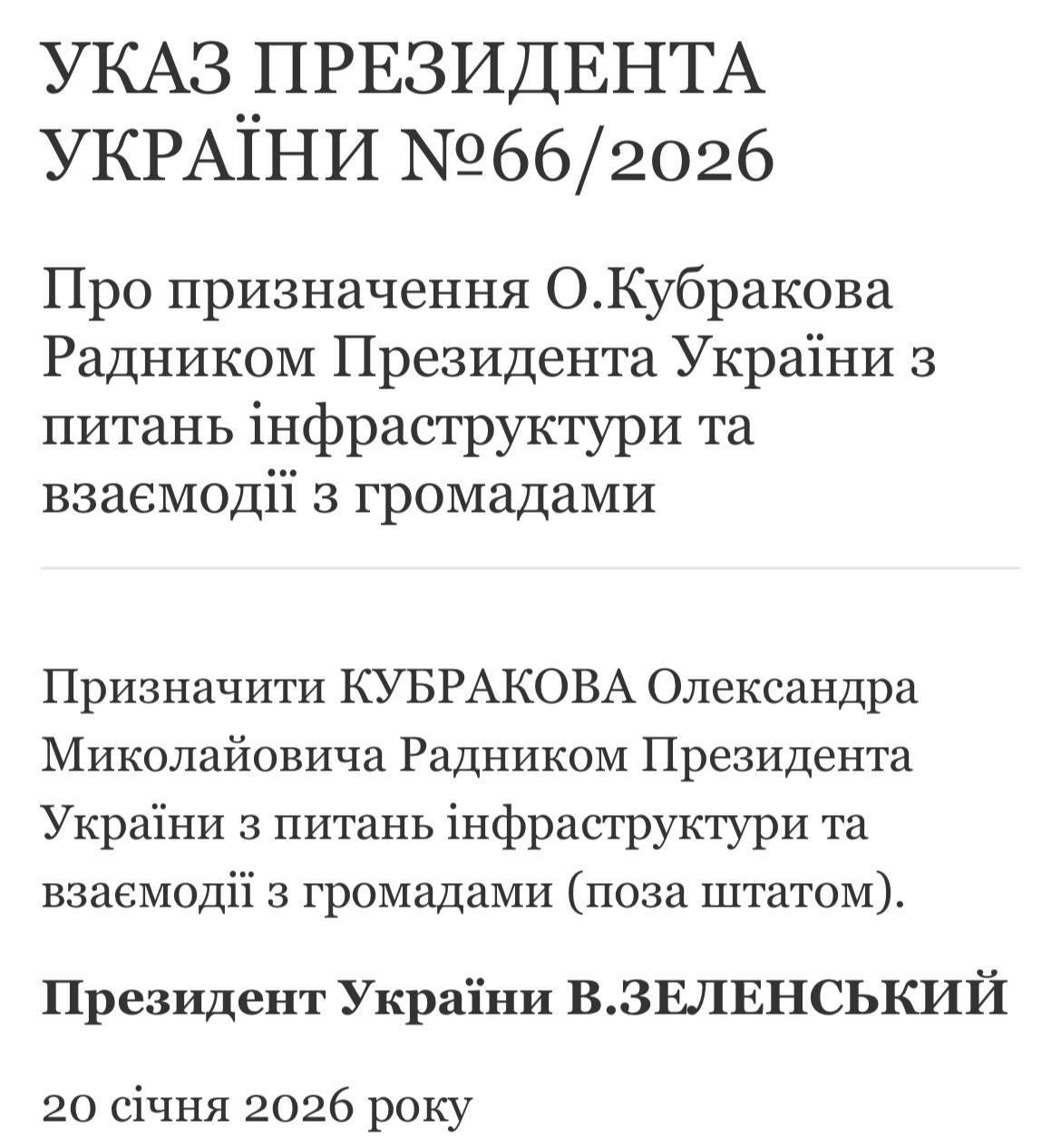 Президент України Володимир Зеленський призначив колишнього віце-прем'єра Олександра Кубракова своїм позаштатним радником з питань інфраструктури та взаємодії із громадами.