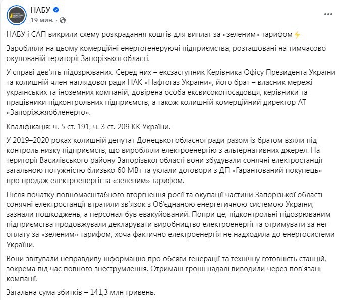 НАБУ вдалося викрити схему розкрадання комерційними енергогенеруючими підприємствами коштів на "зеленому" тарифі. Підприємства були розташовані у захопленій РФ частині Запорізької області.