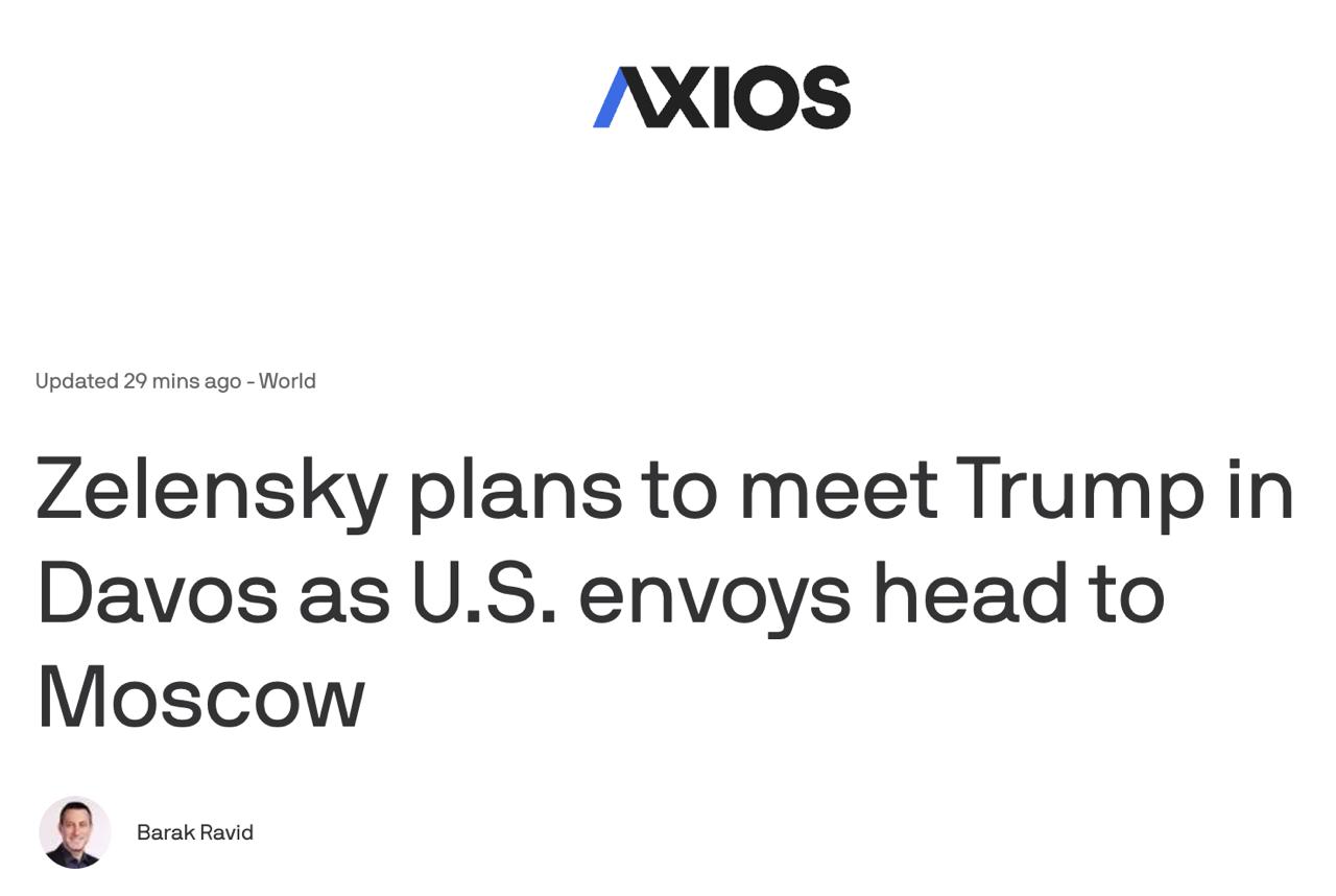 За даними Axios, зустріч Зеленського та Трампа відбудеться завтра у Давосі. Про це повідомив український чиновник.